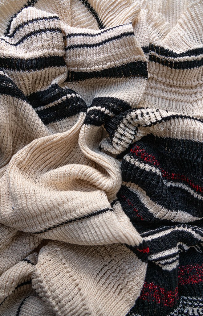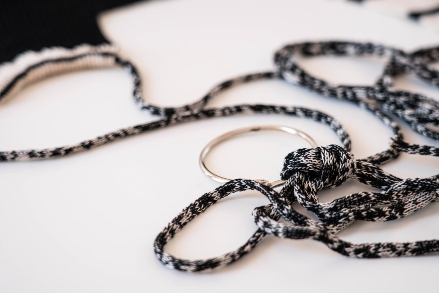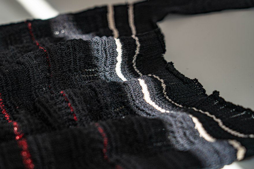 The fabrics are presented as an interactive installation, as they move according to the distance of the viewer. In fact, the shape memory alloy wire incorporated is activated by a sonic distance sensor, a low voltage battery and programmed through Arduino.